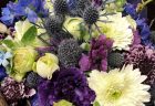 今回使用した花材は、バンダ・バラ・エリンジューム・トルコキキョウ・アルストロメリア・ガマズミ・ブプレリューム・ユーカリ・ストック・スイートピーを使用しました。