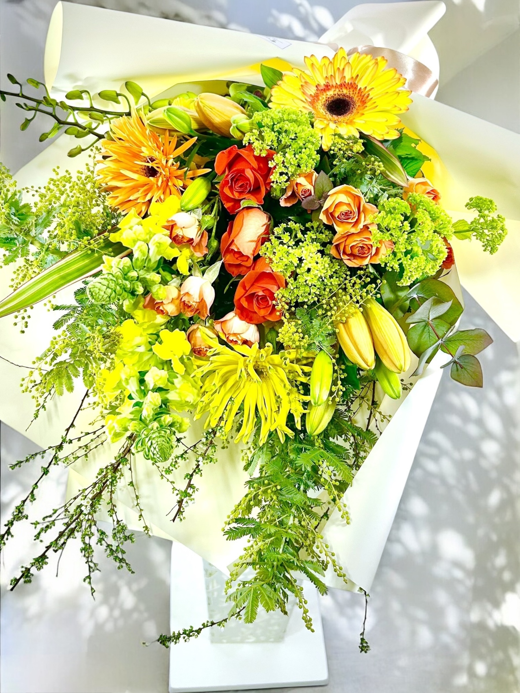 ■ コメント:スタイリッシュな丈長めの花束。
