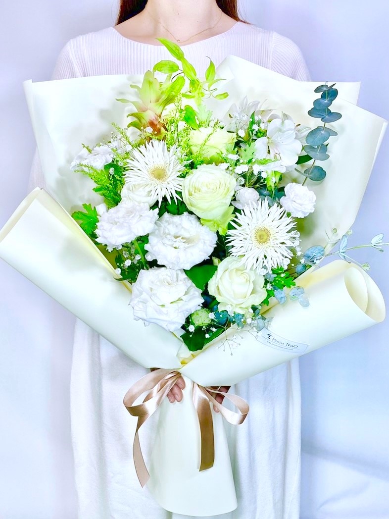 レギュラー白系花束 (bouquet123) 販売価格(税込)¥5,500在庫状態 : 在庫有り■ サイズ(約):高さ50×幅35cm ■ コメント:ボリュームもある、素敵なワンサイド花束。 ■ 品番:花束123 ★横浜市中区西区南区への配達に限ります。 ★原則前日17時までの申し込みとなります。 ★お届け日当日の申し込みは、ご注文の前にお電話にてお問い合わせください。 配達状況を確認します。TEL:045-641-3057 ※季節・仕入れ状況により花材や資材が異なることがありますご了承ください。 ※天候・受注状況によりご注文を受けられない場合があります。 数量